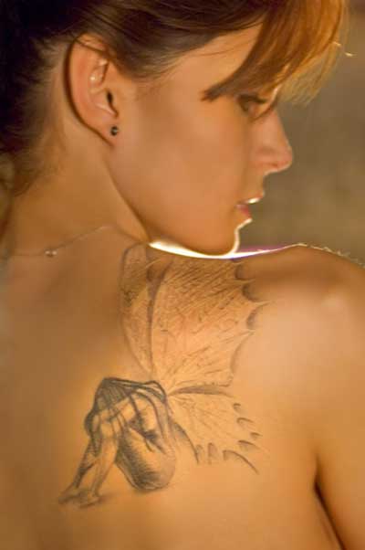 Fairy tattoos can be tiny little designs, hidden on a hip or on a shoulder of women. Or they can be large images, rendered as a singular design, or your fairy can be part of a larger scene, possibly with the aforementioned unicorn or peeking out from behind a flowering branch. Often the wings allow the design to be fitted well to the shape of the upper arm or lower leg of women.